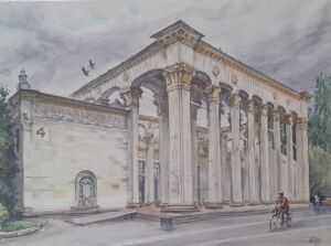 Папір, олівець, ще олівець, малюнок, замочив фарби, папір, пензлі, примружився, попливло-розтікається, кобальт, ще трохи краплаку, смарагдова, охра, крона тополі, загальна форма павільйону, колонна, прапори зверху, як цікаво виходить, скульптурна група над входом, темна мозаїка у них за спиною, колони, ще колони, як їх там багато, ліхтар на передньому плані, самшитовий зелений парканчик, дорога, ще дорога, розмітка білим, постать хлопця.
